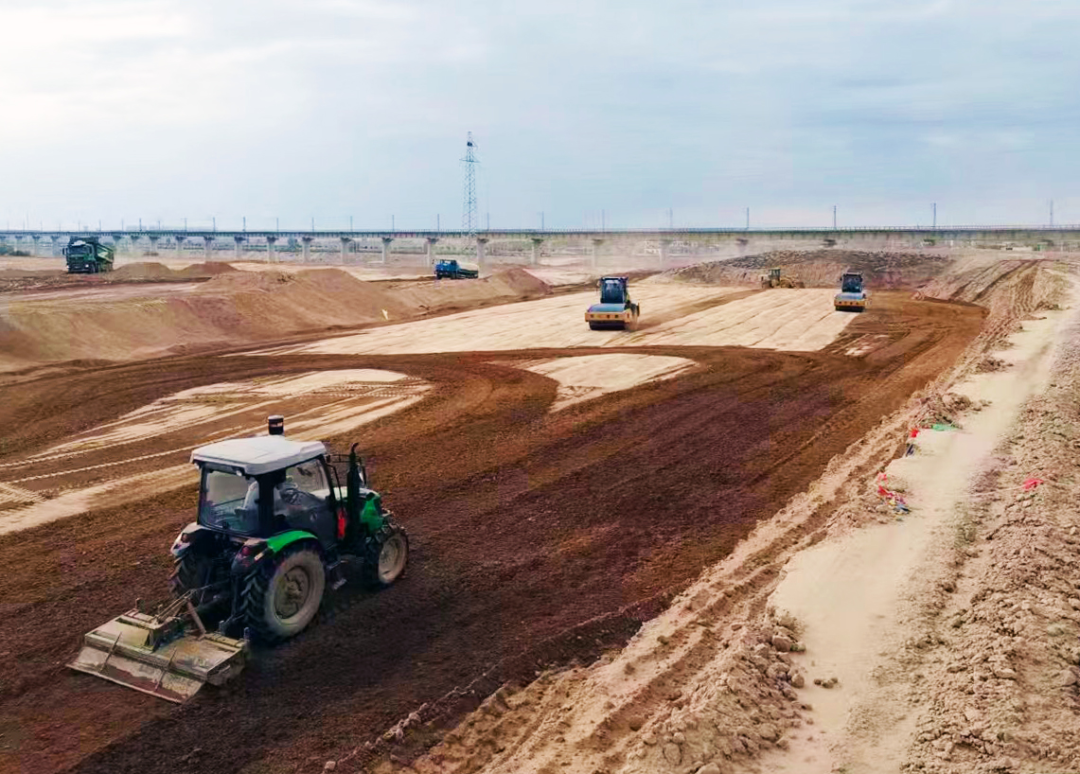 项目自进场以来,公司高度重视,积极主动谋划,选优配齐项目管理团队,建立安全质量管理体系,编制切实可行的管理策划,在确保安全、质量、成本前提下,提高工作效率,细化管理措施,确保实现业主确定的节点任务目标。截至目前,已完成原地面强夯163000㎡、路基土方回填93000m³、外弃土方367600m³、西侧场平土方311000m³、三七灰土填筑29000m³的工作量。