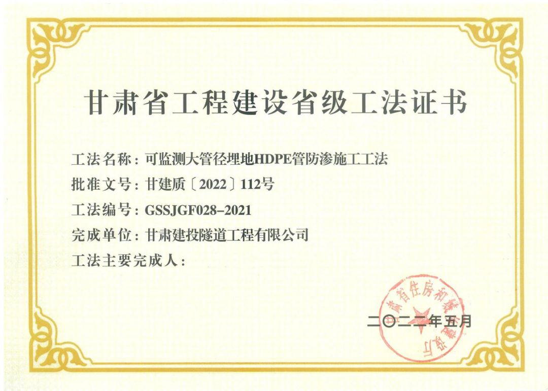 另外,二公司申报的省级工法《可监测大管径埋地HDPE管防渗施工工法》被评为2022年度省级优秀工法。该工法是针对管径大、管道埋设较深、排水量大、铺设点地质复杂(特别是西北区域湿陷性黄土地区)、管道接口施工质量难以保证、管道破损危害大且维修检测困难等问题提出来的,经一年多来的实践证明,本工法技术先进、安全适用,效益显著,值得向全社会推广应用,有良好的应用前景。