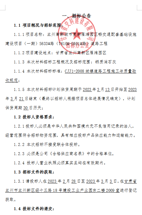 兰州高新城市更新雁滩园区畅交通配套基础设施建设项目(一期)S633#路(T610#-S601#路)道路工程材料招标公告