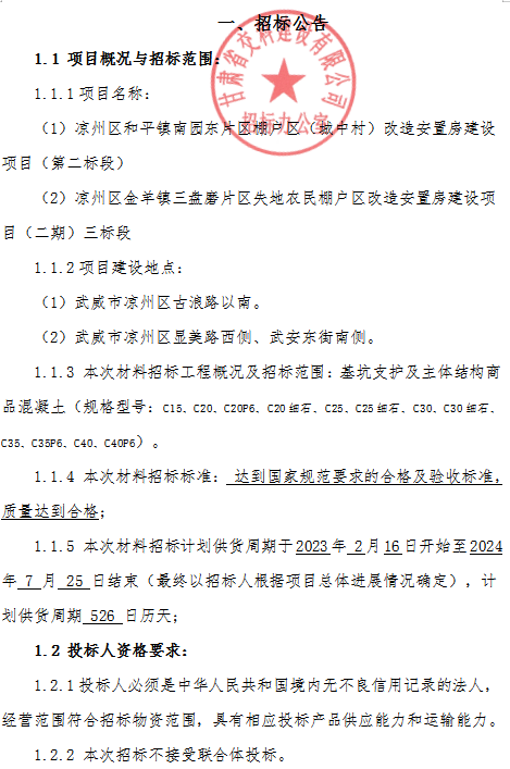 凉州区和平镇南园东片区棚户区(城中村)改造安置房建设项目(第二标段); 凉州区金羊镇三盘磨片区失地农民棚户区改造安置房建设项目(二期)三标段商品混凝土招标