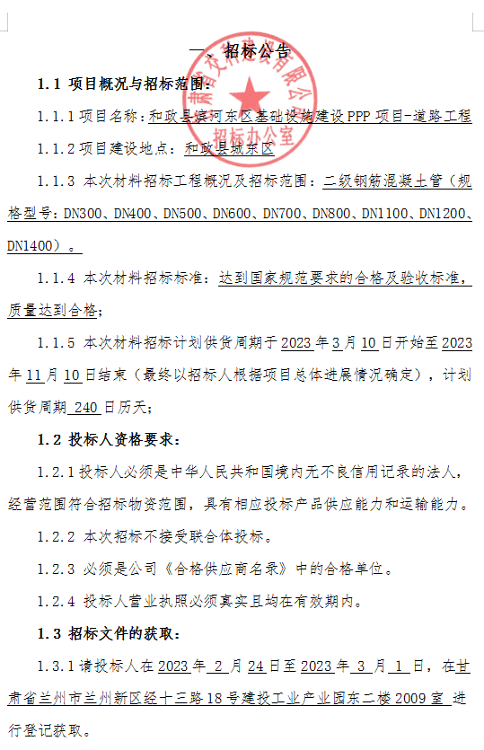 <h3>和政县滨河东区基础设施建设PPP项目-道路工程材料招标公告</h3>