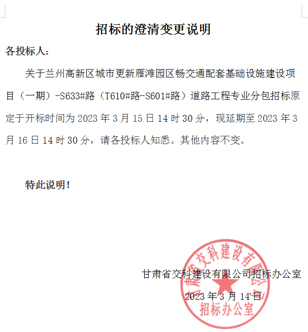 关于兰州高新区城市更新雁滩园区畅交通配套基础设施建设项目(一期)-S633#路(T610#路-S601#路)道路工程专业分包-澄清说明