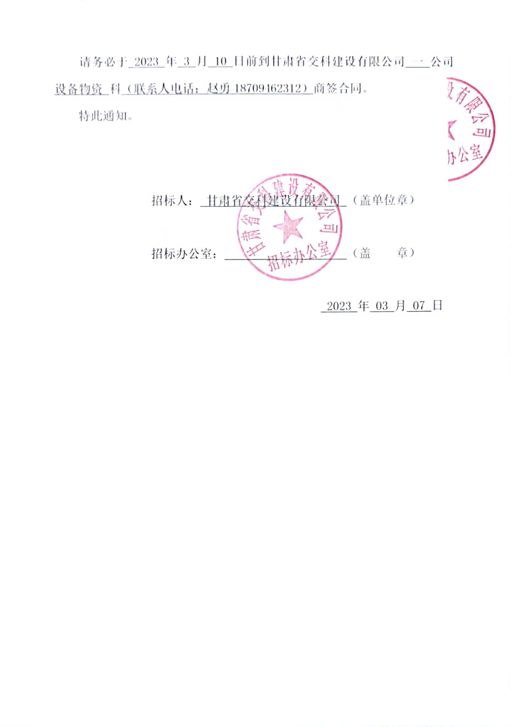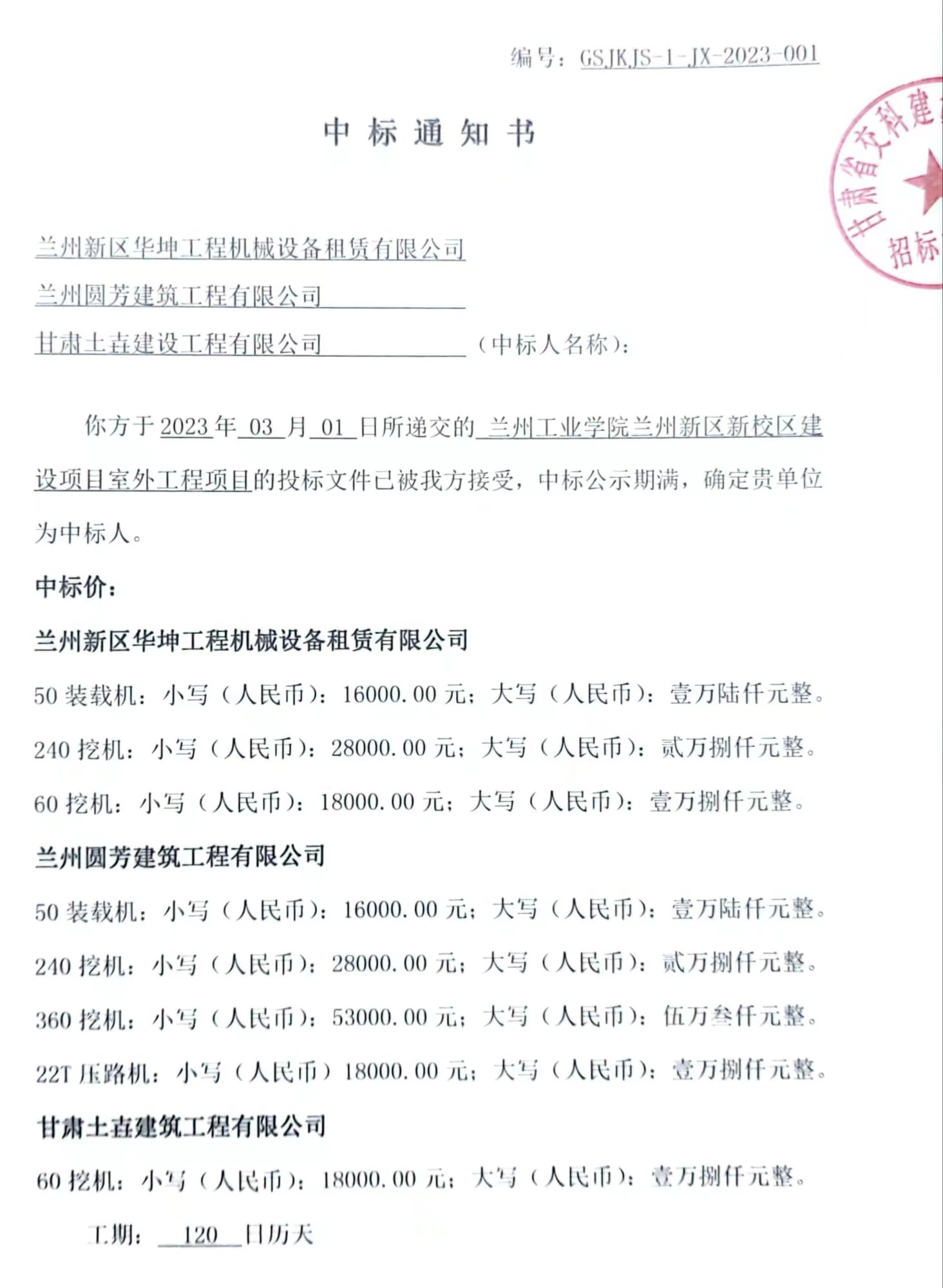 兰州工业学院兰州新区新校区建设项目室外工程项目中标候选人及中标通知书