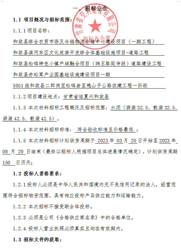 <h3>和政县综合农贸市场及冷链物流仓储中心建设项目（一期工程）；和政县滨河东区文化旅游开发综合体基础设施项目-道路工程 ；和政县松鸣特色小镇产城融合项目（纬五路延伸段）道路建设工程；和政县赤松茸产业园基础设施建设项目一期；X051线和政县二郎岗至松鸣岩至槐山子公路改建工程一材料招标公告</h3>