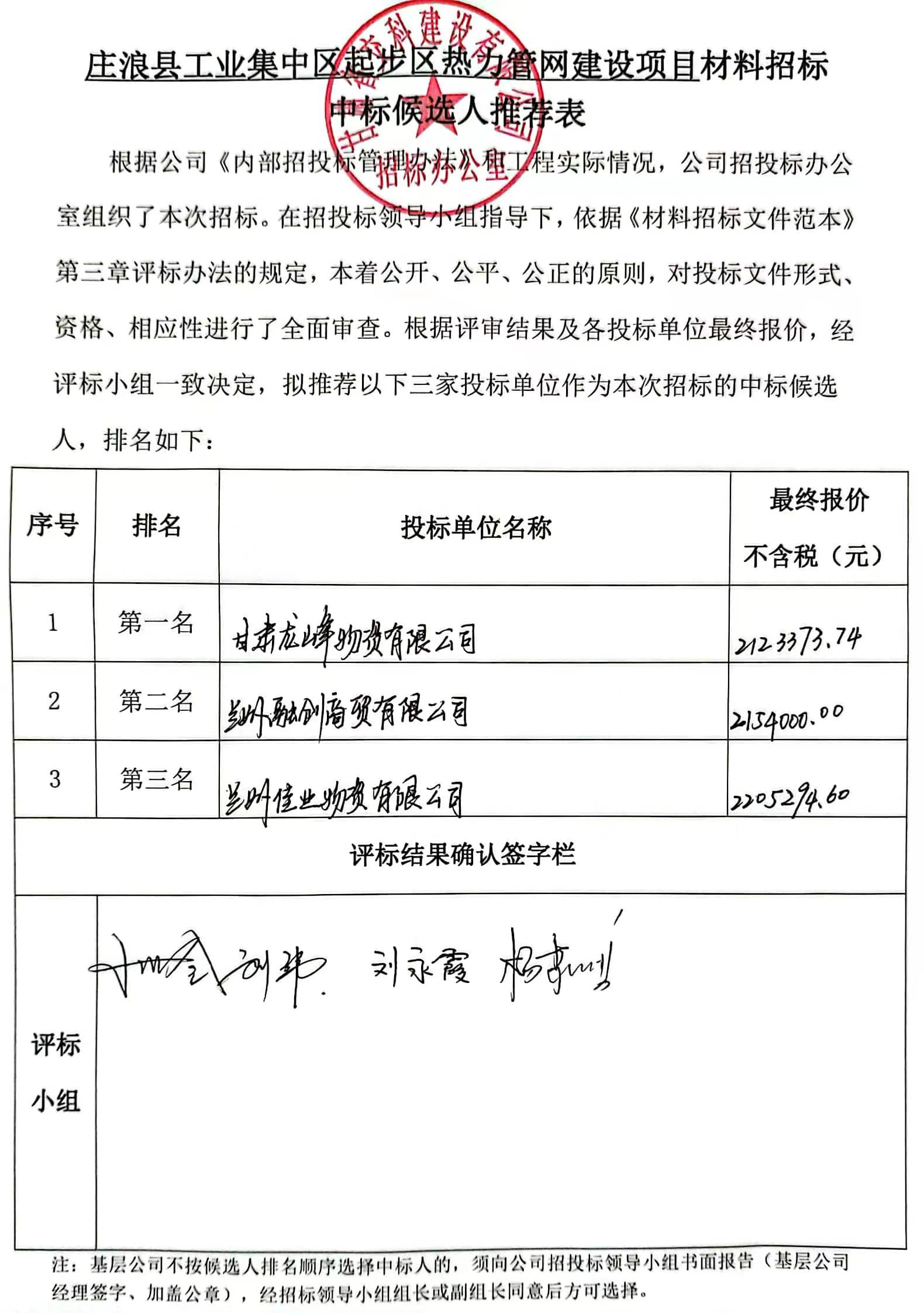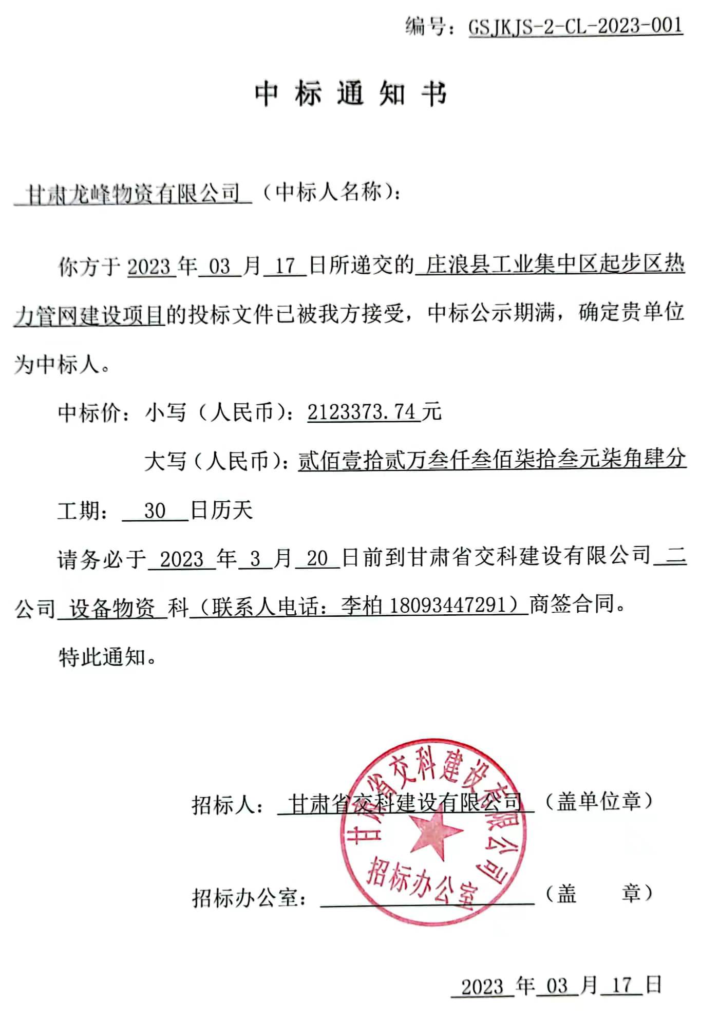 庄浪县工业集中区起步区热力管网建设项目招标候选人及中标通知书