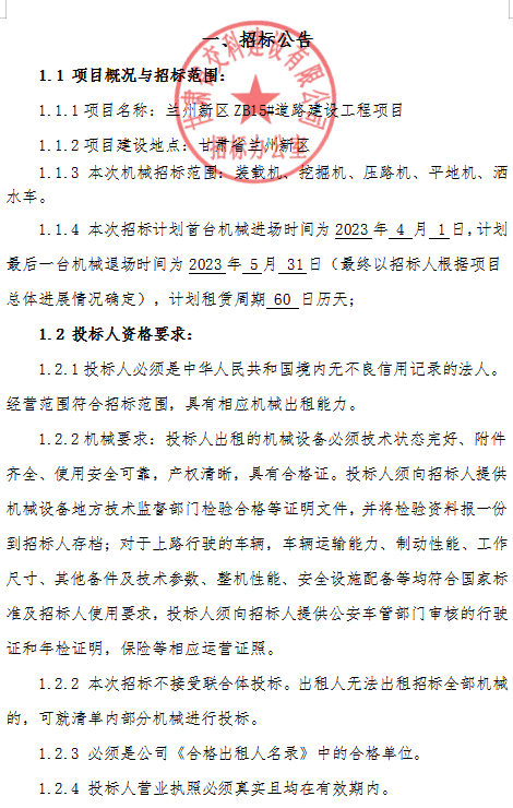 兰州新区ZB15#道路建设工程项目机械租赁招标公告