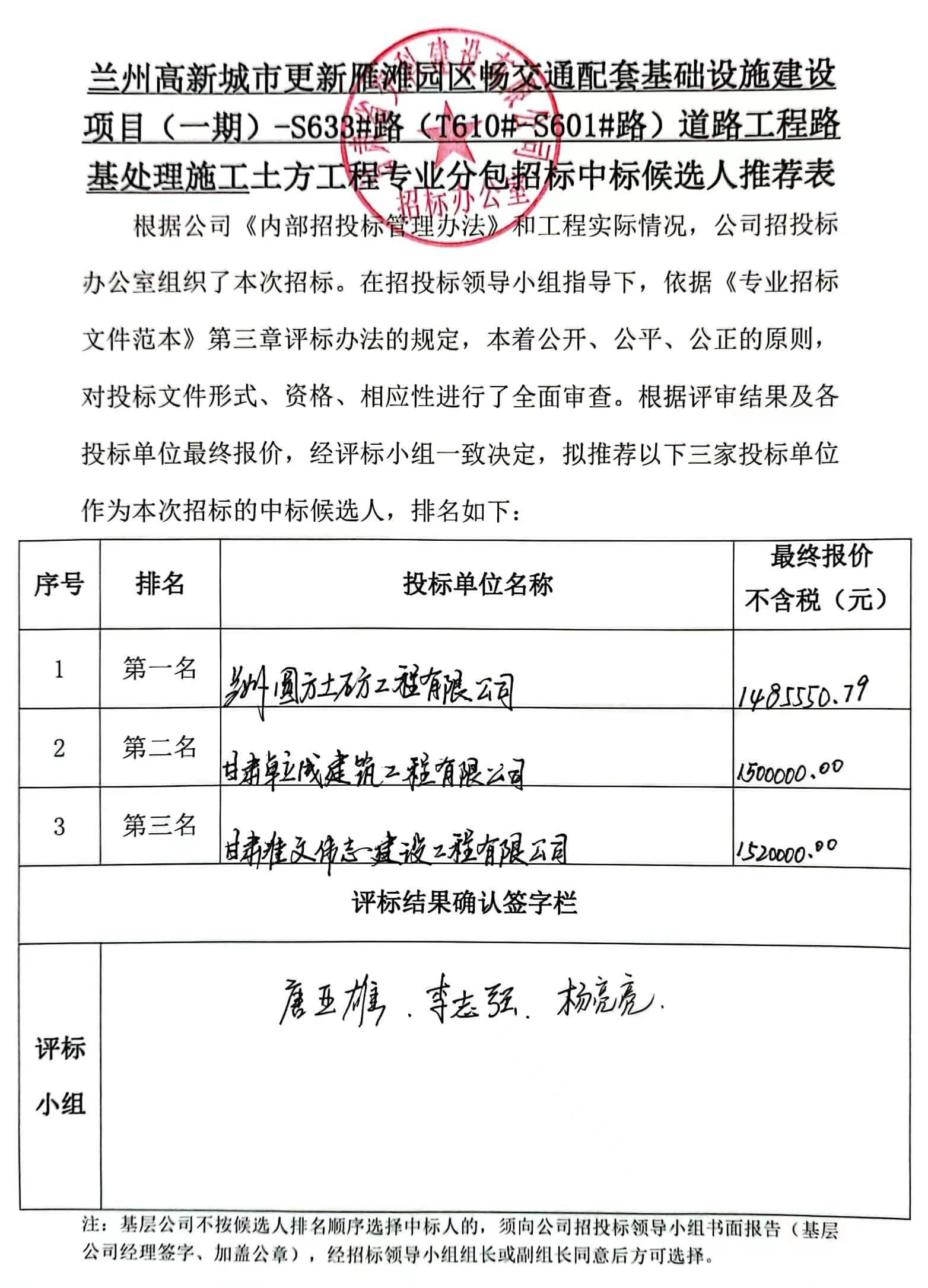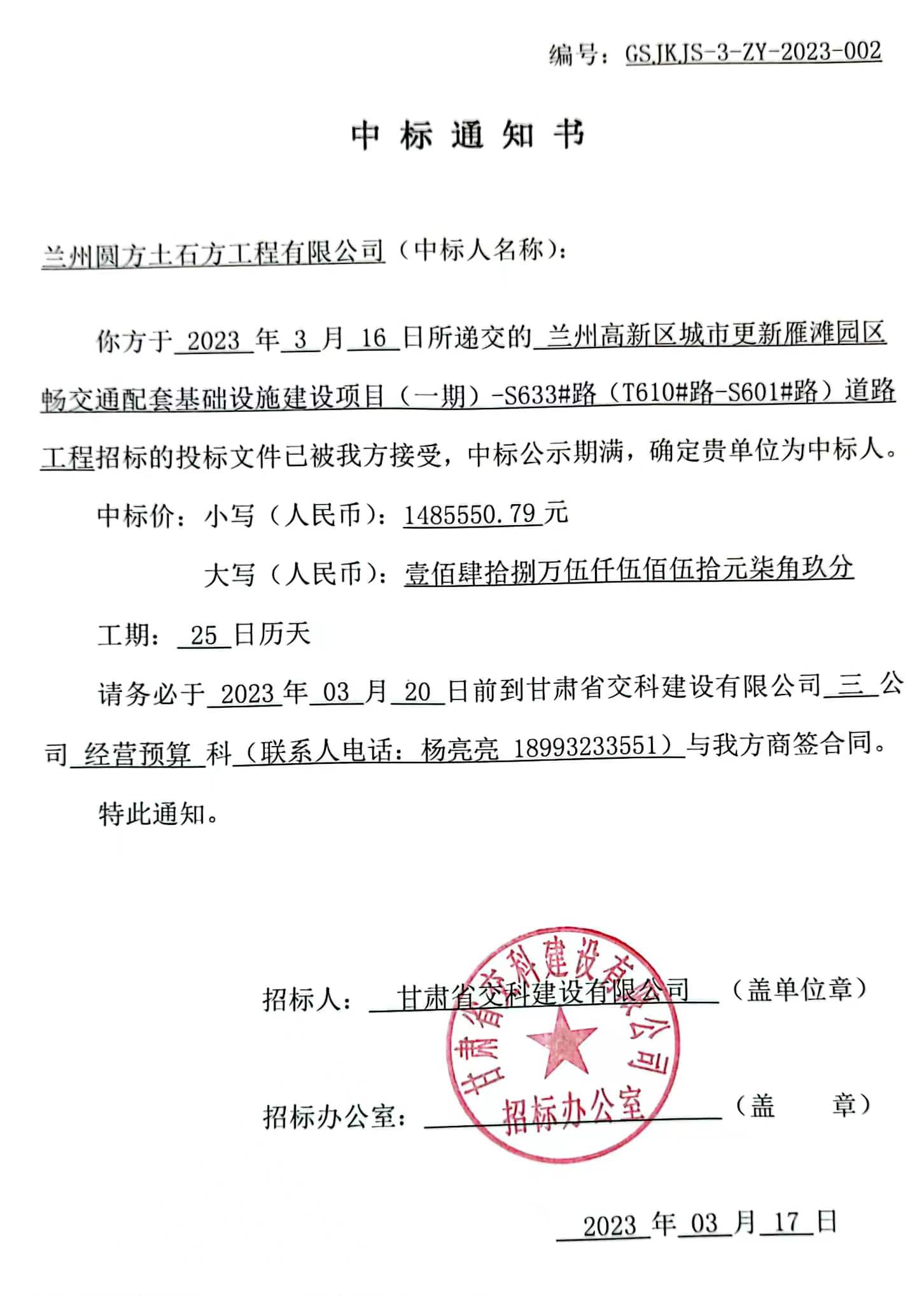 兰州高新城市更新雁滩园区畅交通配套基础设施建设项目(一期)-S633#路(T610#-S601#路)道路工程路基处理施工中标候选人及中标通知书