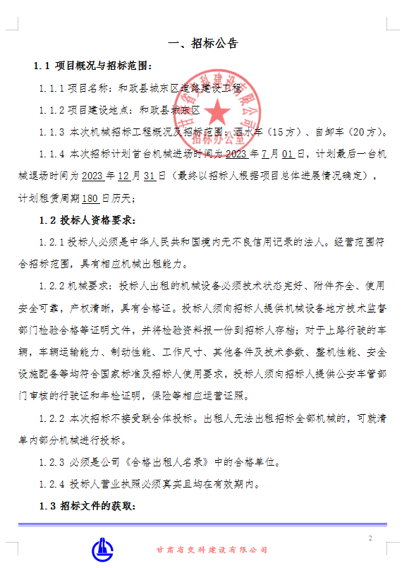 和政县城东区道路建设工程-机械租赁招标公告