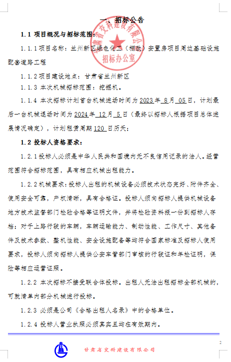 兰州新区绿色化工(棚改)安置房项目周边基础设施配套道路工程机械租赁招标公告