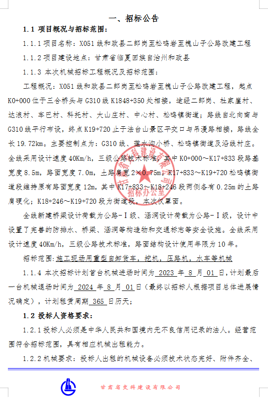 X051线和政县二郎岗至松鸣岩至槐山子公路改建工程机械租赁招标公告