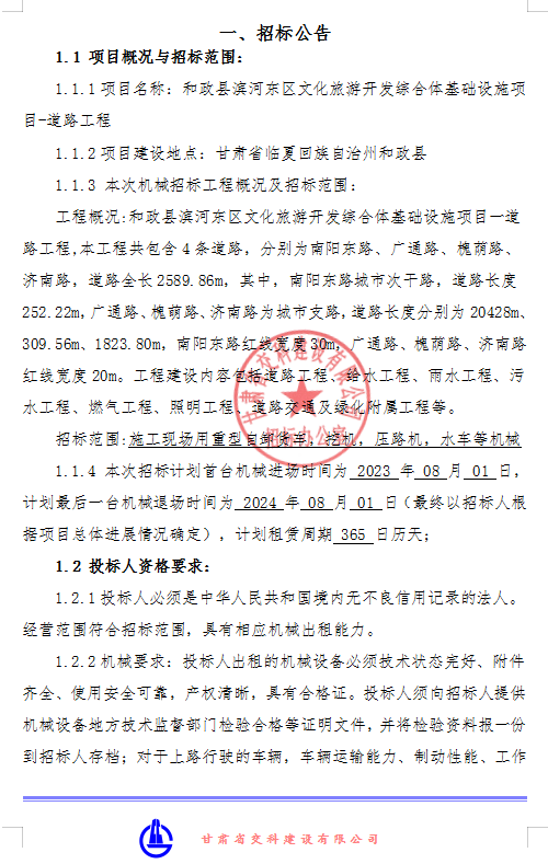 和政县滨河东区文化旅游开发综合体基础设施项目-道路工程机械租赁招标公告