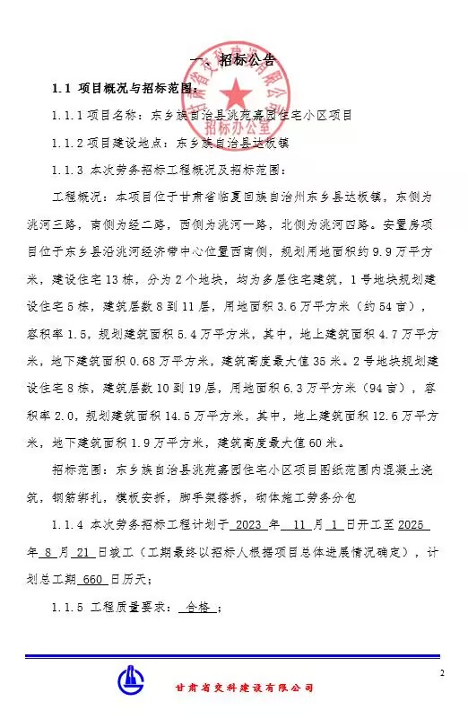 东乡族自治县洮苑嘉园住宅小区项目劳务招标公告