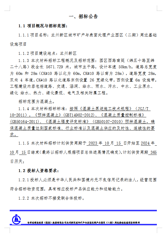 兰州新区城市矿产与表面处理产业园区(二期)周边基础设施项目-混凝土招标公告