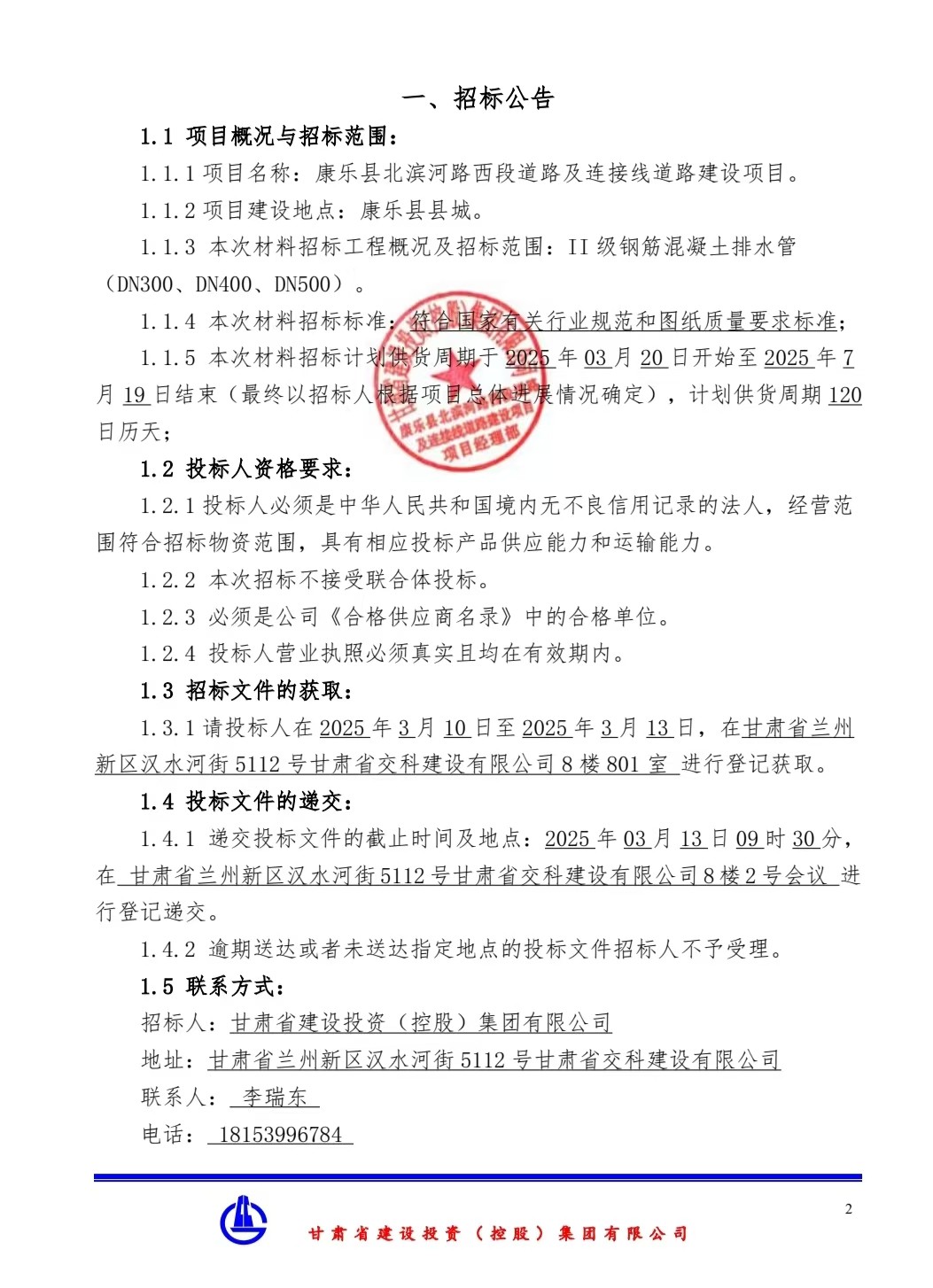 康乐县北滨河路西段道路及连接线道路建设项目-材料招标公告