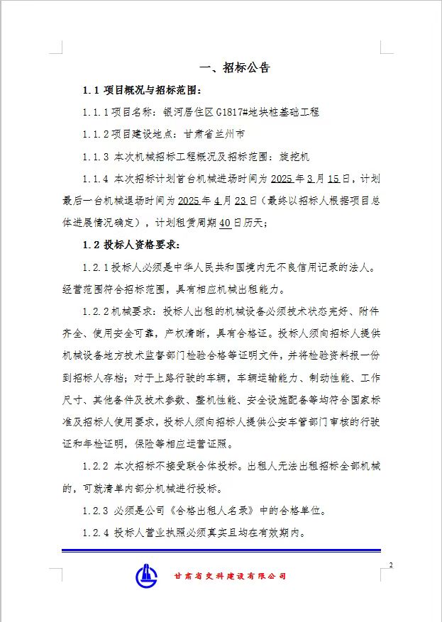 银河居住区G1817#地块桩基工程旋挖机招标公告