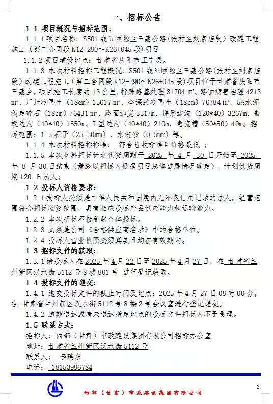 S501线五顷塬至三嘉公路(张村至刘家店段)改造工程施工(第二合同段K12+290-K26+045段)项目石子及水洗砂招标公告