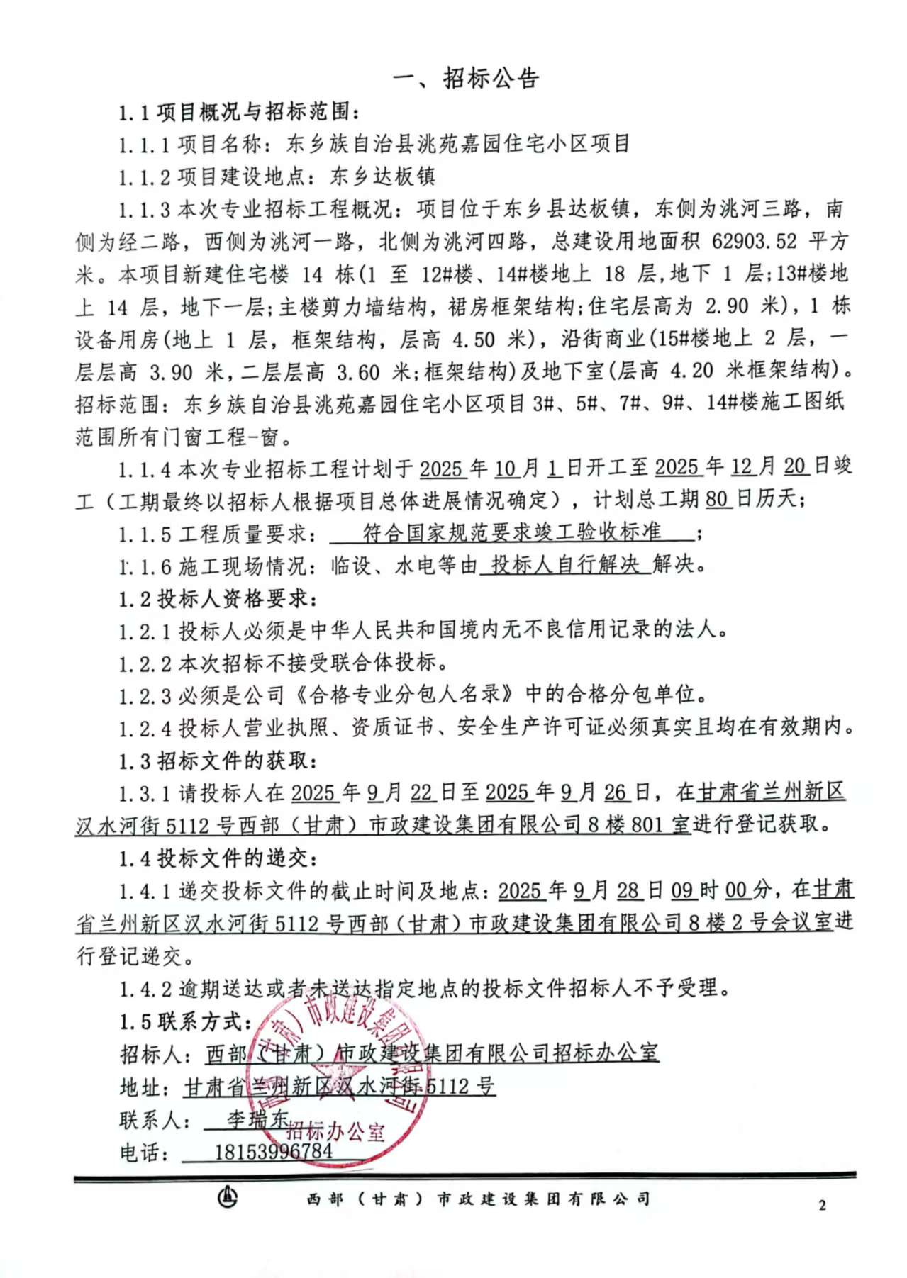 东乡族自治县洮苑嘉园住宅小区项目-窗-招标公告