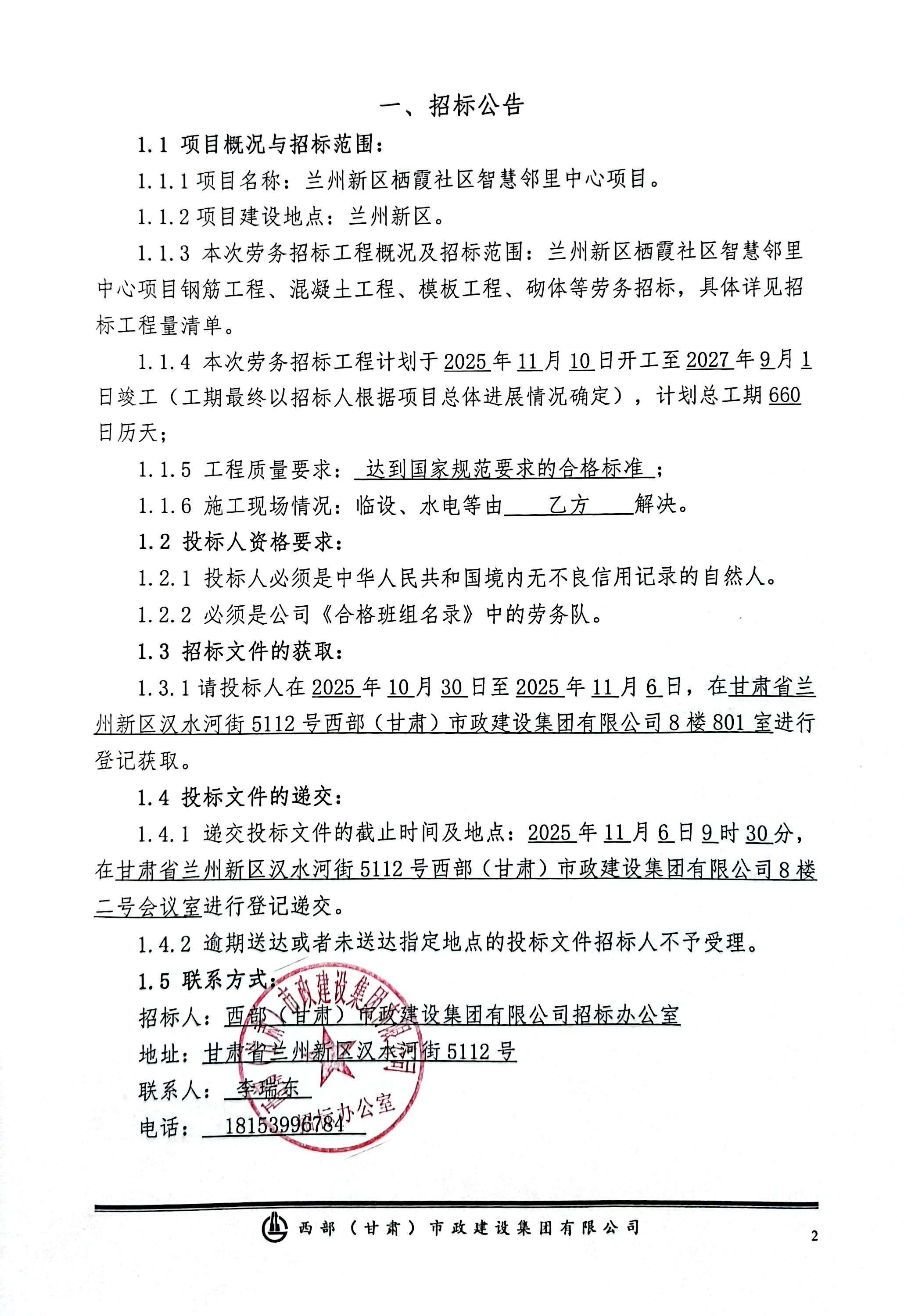 兰州新区栖霞社区智慧邻里中心项目-钢筋工程、混凝土工程、砌体工程等劳务-招标公告